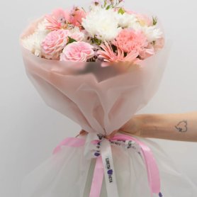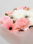 Букет «Дыхание весны»: нежное переплетение розовых гербер, роз, диантусов и белых хризантем, способное выразить чувства без слов.