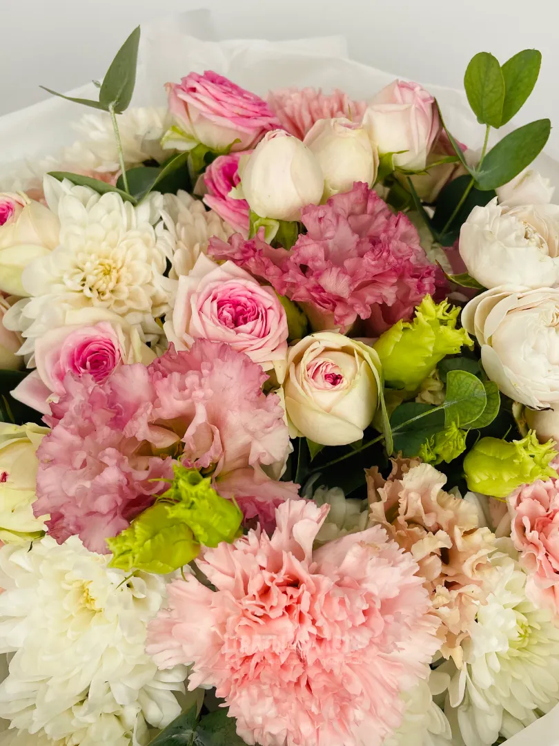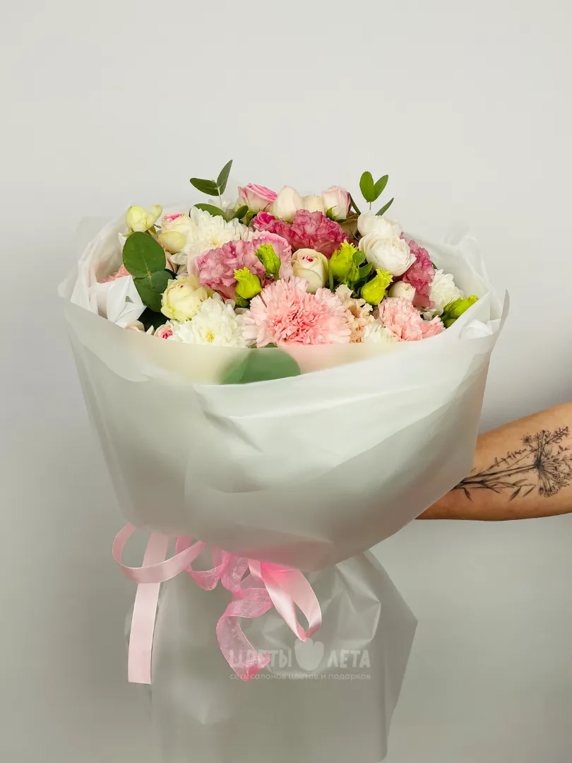 Состав может незначительно меняться, в зависимости от поставок и сезонности цветов, поэтому актуальное наличие уточняйте пожалуйста у менеджеров или в соцсетях.