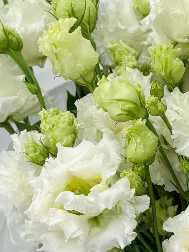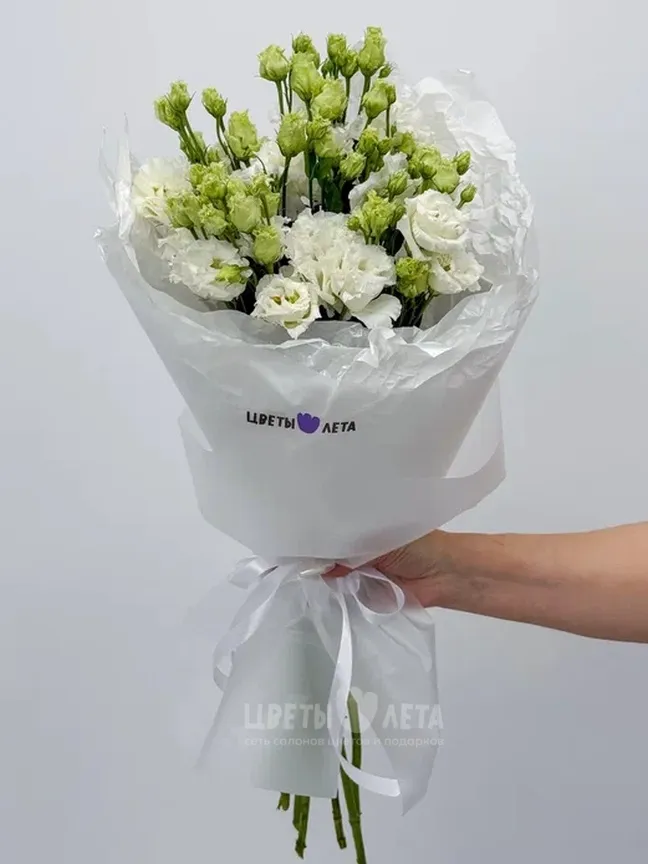 Элегантный букет из белой эустомы – это воплощение изысканного вкуса и безупречного стиля. Нежные, словно шелк, цветы грациозно сочетаются в этой композиции, создавая атмосферу роскоши и утонченности. Прекрасный выбор для особых случаев.