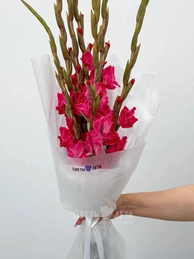 Роскошный букет розовых гладиолусов – это символ элегантности и торжества. Стройные стебли, увенчанные каскадом нежных цветов, создают впечатляющий и запоминающийся образ. Прекрасный подарок для особых случаев и важных событий.