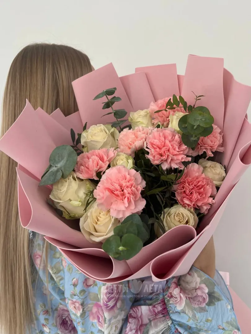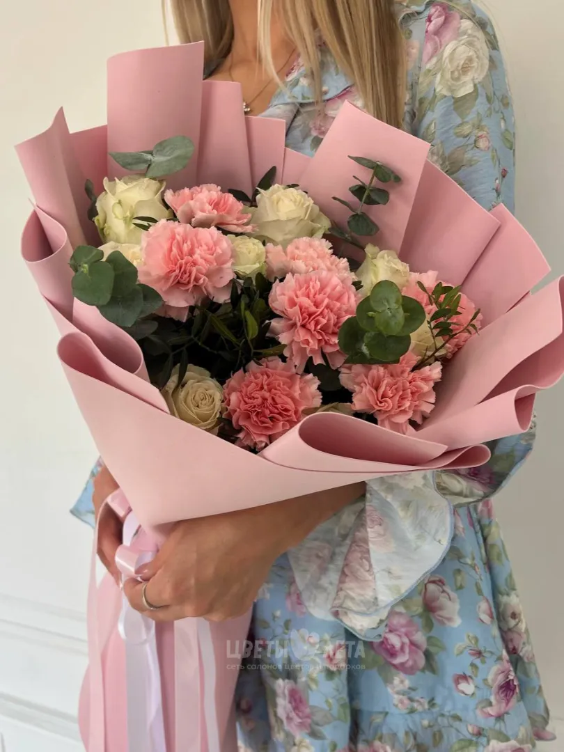 Букет «Зефирный» - это гармоничное сочетание белоснежных роз и нежно-розовых гвоздик. Воздушные, как зефир, цветы создают ощущение легкости и безмятежности. Идеальный подарок для тех, кто любит нежные и изысканные композиции.