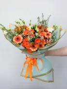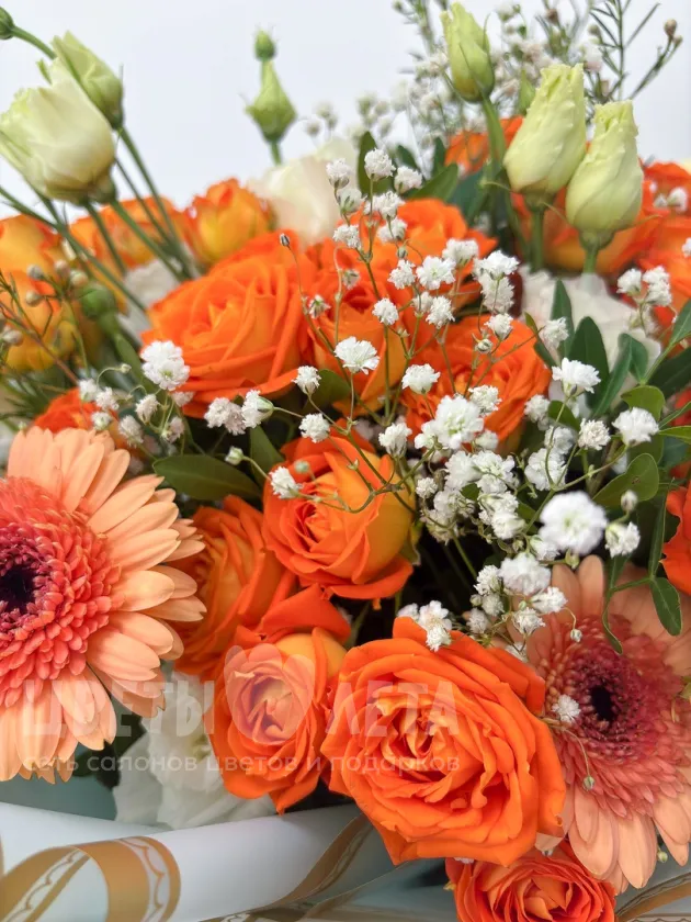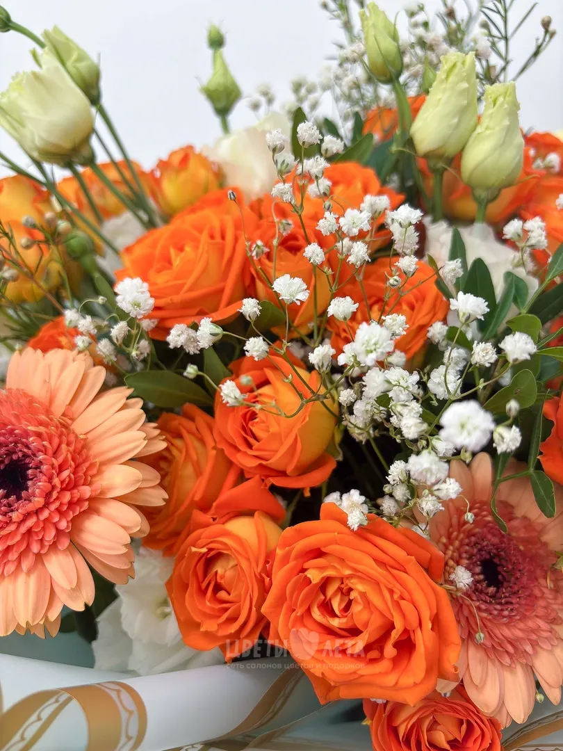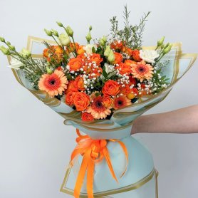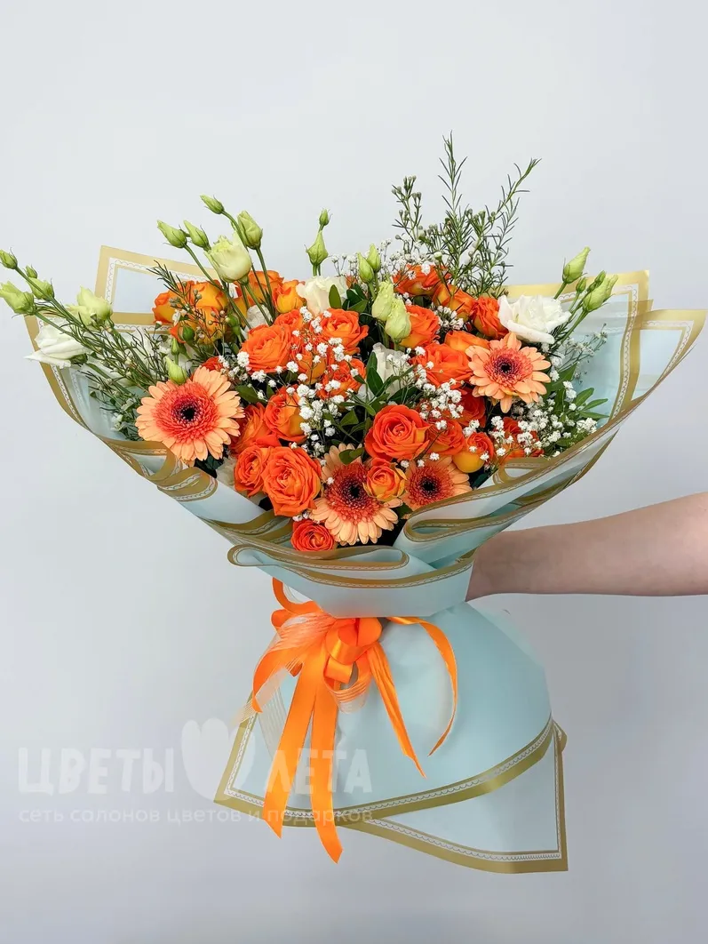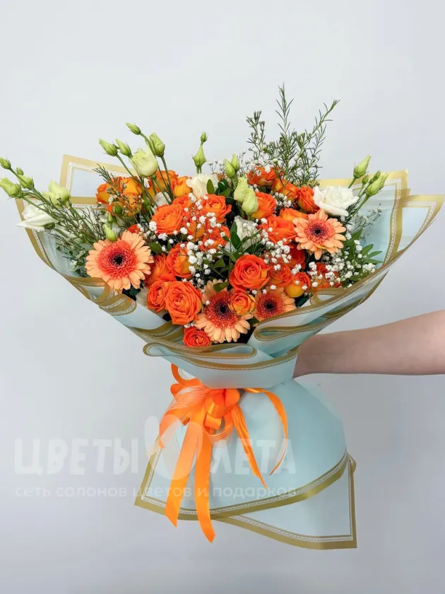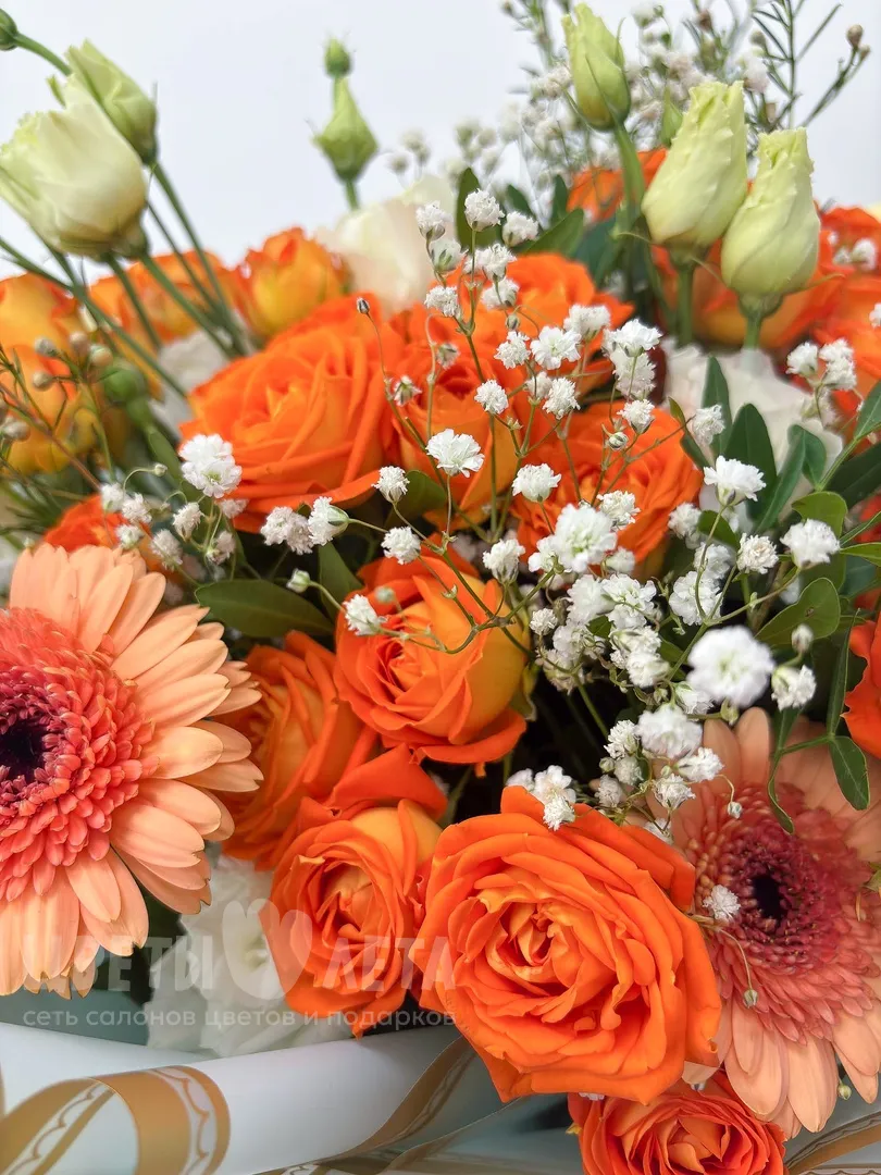 Почувствуйте дыхание осени с букетом «Тыковка»! Оранжевые кустовые розы и герберы, воздушная гипсофила и нежная эустома, словно осенние листья, переливаются теплыми оттенками. Этот букет – как воспоминание о ярких осенних днях, о теплых вечерах у камина. Он создан для тех, кто ценит красоту осенней природы.