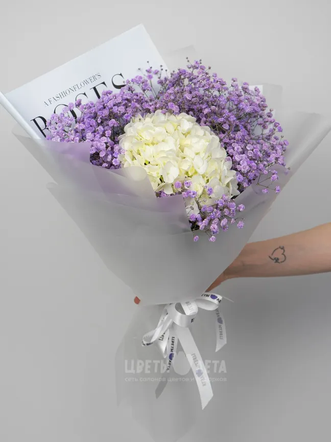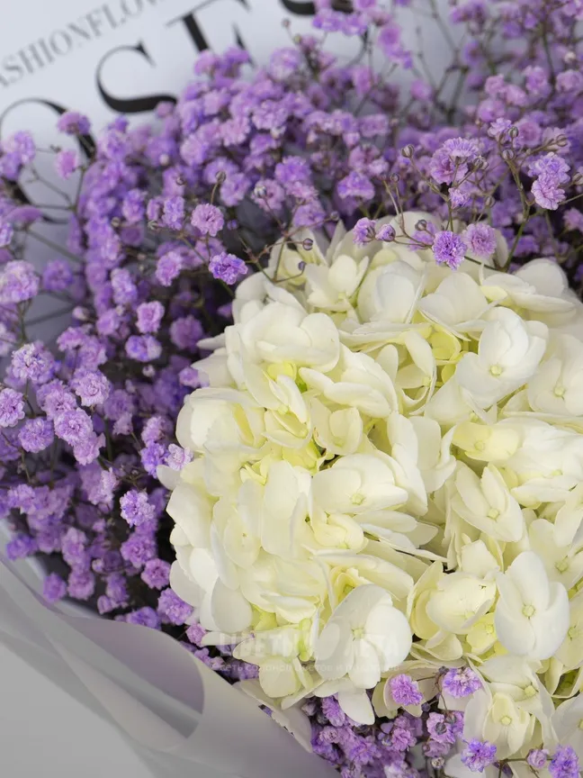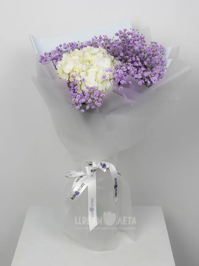 Погрузитесь в мир волшебства и тайн с букетом «Зачарованный сад»! Белоснежная гортензия, словно лунный свет, в окружении фиолетовой гипсофилы создает атмосферу загадочности и очарования. Этот букет – как портал в другой мир, где живут сказки и исполняются мечты.