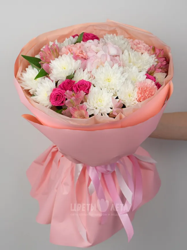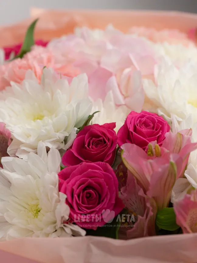 Насладитесь гармонией красок с букетом »Розовая симфония"! Этот букет, словно музыка, наполнен радостью, позитивом и нежностью. Розовые хризантемы, кустовые розы, гортензия и альстромерии создают неповторимую мелодию цвета и формы, которая подарит хорошее настроение на весь день.