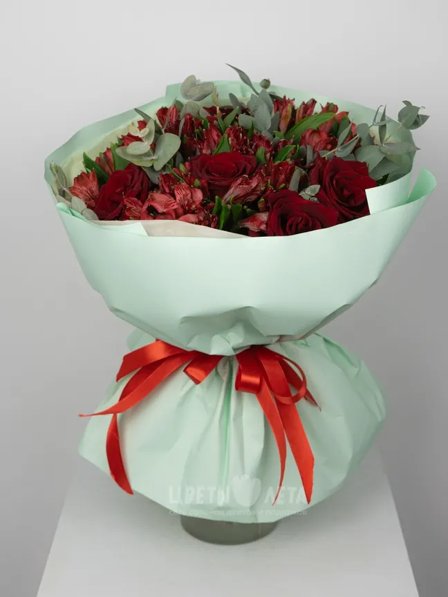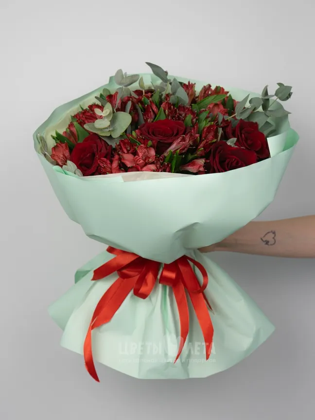 Покорите всех своим великолепием! Пышный букет из красных роз и альстромерий – это триумф красоты, страсти и роскоши.