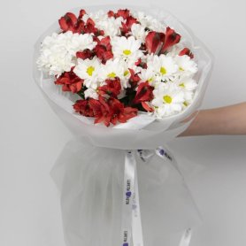 Подарите взрыв эмоций с этим ярким букетом! Ромашковые хризантемы, словно маленькие солнышки, в сочетании с алыми альстромериями создают атмосферу радости, тепла и оптимизма.