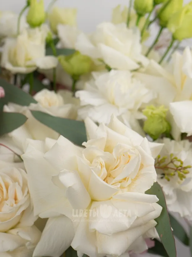 Оцените изысканность и элегантность букета «Белое кружево»! Белоснежные розы, эустома и диантусы, переплетенные с нежно-розовыми акцентами, создают неповторимый образ, полный шарма и утонченности. Этот букет – идеальный выбор для тех, кто ценит красоту в каждой детали. Состав композиции может незначительно меняться в зависимости от сезонности и наличия цветов. Пожалуйста, уточняйте состав и наличие у наших менеджеров или в социальных сетях.