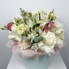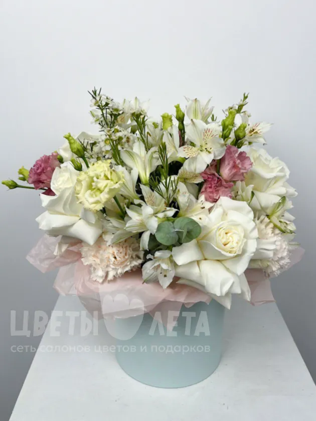 Состав композиции может незначительно меняться в зависимости от сезонности и наличия цветов. Пожалуйста, уточняйте состав и наличие у наших менеджеров или в социальных сетях.